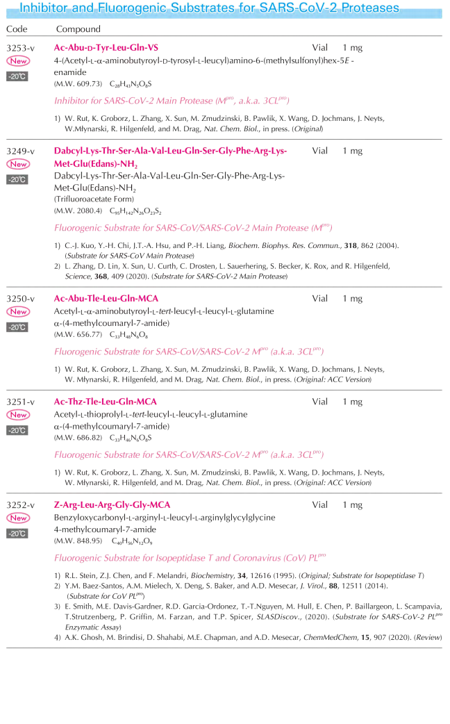 Inhibitor and Fluorogenic Substrates for SARS-CoV-2 Proteases