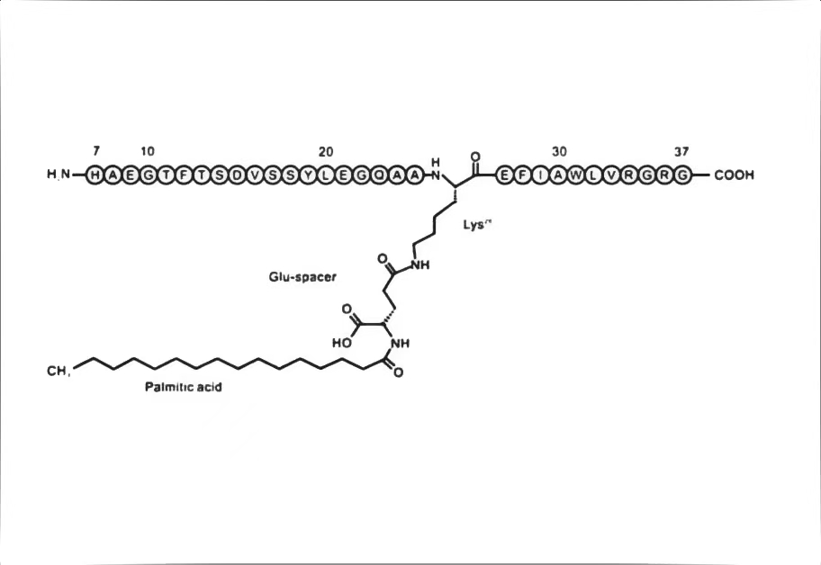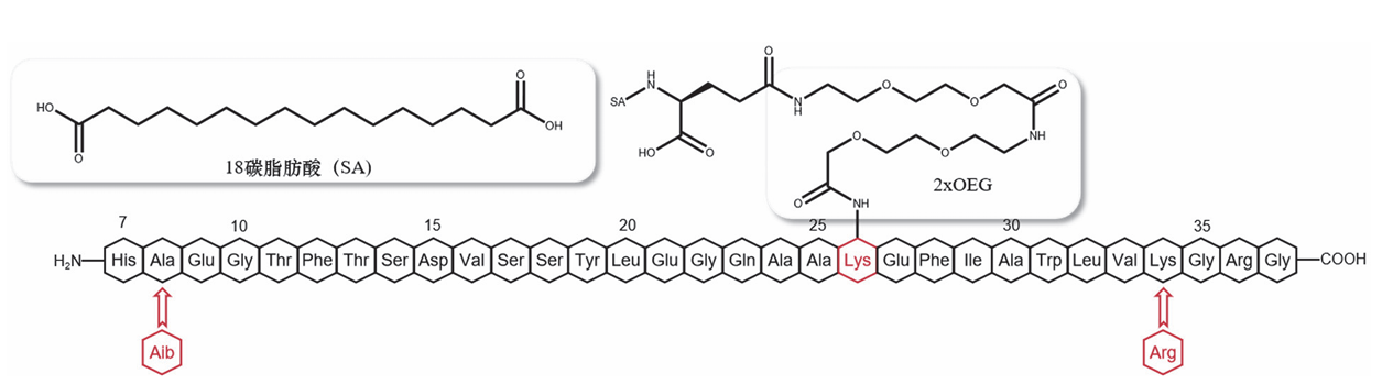 相较于GLP-1来说,其有3个重要的结构修饰:第8位的丙氨酸以α-氨基丁酸(aminobutyric acid,Aib)取代;第34位的赖氨酸以精氨酸(arginine,Arg)取代;第26位的赖氨酸被带有18碳脂肪酸(stearic acid,SA)的连接官能团酰化。