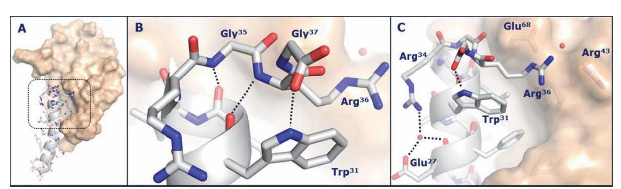 (A) 与GLP-1受体胞外结构域(金色表面)复合的司美格鲁肽肽骨架(灰色)的晶体结构; (B,C) 放大整体结构