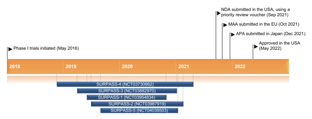 (A) 替尔泊肽治疗2型糖尿病的关键里程碑